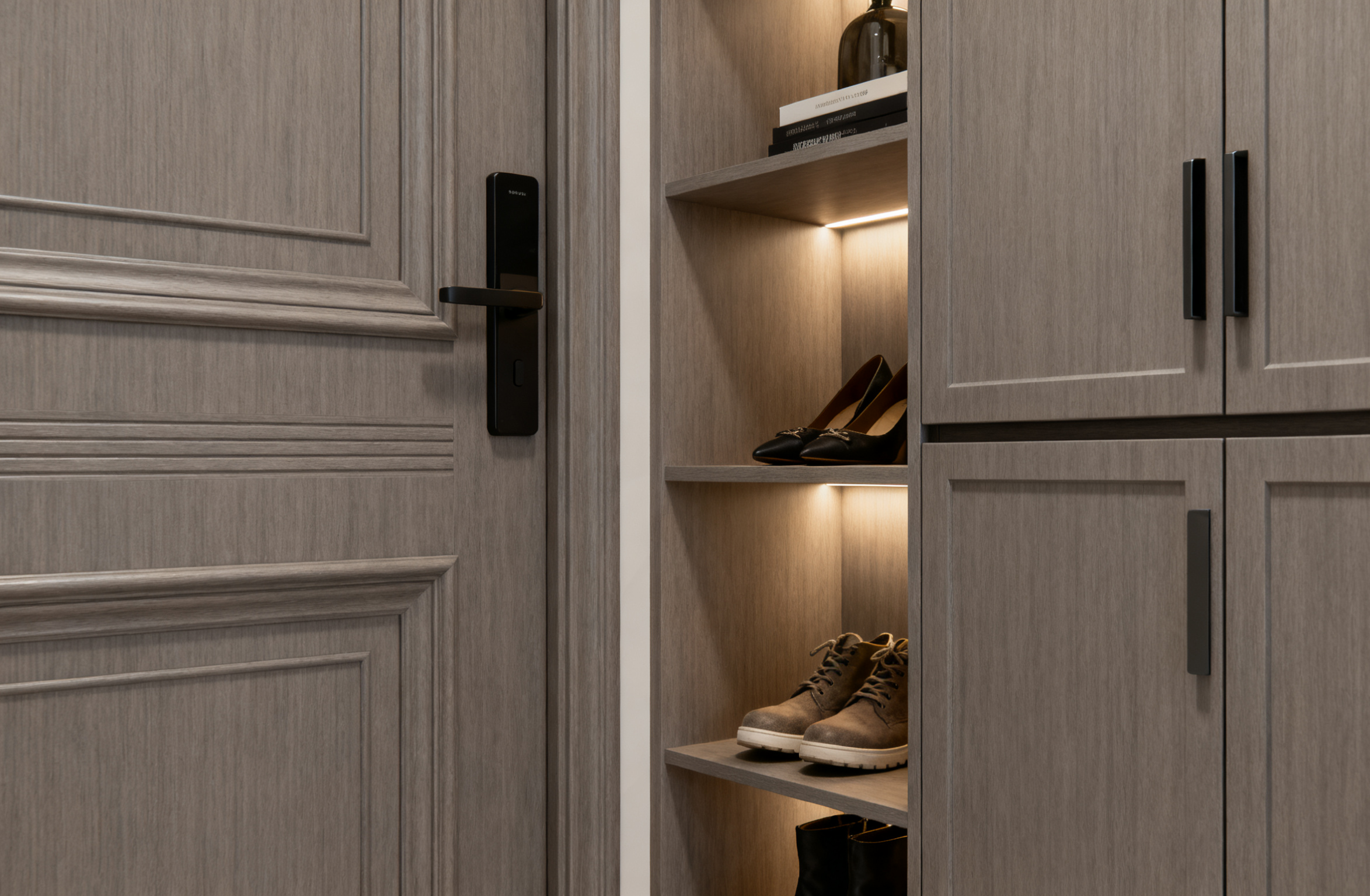 高級居家美學(xué)的關(guān)鍵,在于空間的整體性與協(xié)調(diào)性。品橋木門打破 “單一木門” 的局限,推出全屋木作一體化解決方案,將木門與衣柜、護(hù)墻板、餐邊柜等家居單品實(shí)現(xiàn)材質(zhì)、花色、設(shè)計(jì)語言的統(tǒng)一。例如,客廳的灰調(diào)木門與同色系護(hù)墻板形成視覺呼應(yīng),臥室門與定制衣柜無縫銜接,不僅減少空間割裂感,更讓美學(xué)氛圍貫穿全屋。同時(shí),品牌提供 100 + 定制花色與尺寸適配服務(wù),無論是大平層的開闊空間,還是小戶型的緊湊布局,都能通過木門的定制化設(shè)計(jì)優(yōu)化空間比例,讓每一處角落都兼具實(shí)用性與美學(xué)價(jià)值,真正實(shí)現(xiàn) “門與家的共生”。