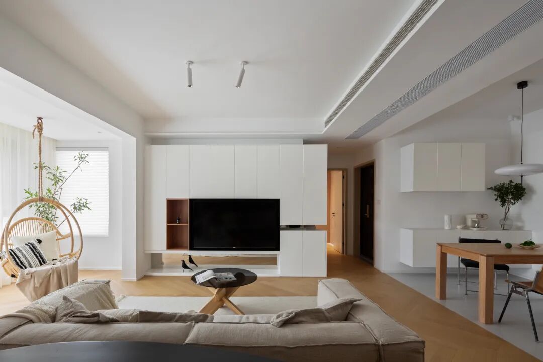 色彩搭配遵循 “631 法則”,以米白、淺灰為背景色(60%),原木為主色調(diào)(30%),搭配陶土、抹茶綠等點綴色(10%),讓視覺更顯通透;