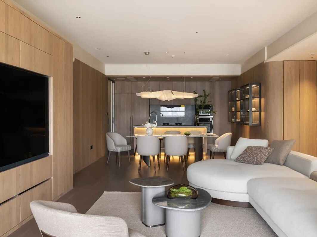 采用通頂柜體、無拉手設(shè)計與隱藏式收納系統(tǒng),減少空間壓迫感,讓木紋成為墻面的自然裝飾;