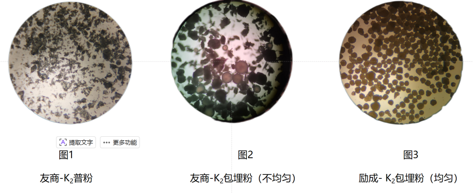無論對比友商的維生素k2粉末還是包埋粉,顯微分析顯示,Rivik2®包埋粉都呈現(xiàn)大小更均一、形態(tài)更規(guī)則的特點,加強了加工過程中的配方混合均勻性。