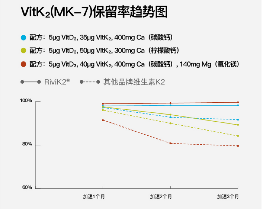 得益于這一雙重防護體系,Rivik2®在復(fù)雜配方中的穩(wěn)定性得到大幅提升,尤其在長貨架期產(chǎn)品及含鈣鎂等礦物質(zhì)的配方體系中表現(xiàn)出明顯優(yōu)勢。經(jīng) 3 個月加速實驗驗證,其在含 D3、碳酸鈣與氧化鎂的配方中,維生素 K2(MK-7)保留率仍高達 99.7%,穩(wěn)定性表現(xiàn)突出。