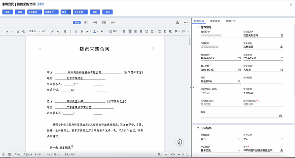 在合同中心中,可以借助合同模板或上傳文件的方式快速起草合同,但是存在部分合同內(nèi)容復雜,人工定位關鍵合同信息耗時耗力。為此,AI合同智能體代替人工錄入,快速自動提取復雜合同中關鍵信息,并生成結(jié)構(gòu)化的合同臺賬,同時,臺賬信息修改后能夠?qū)崟r同步修改對應的合同,讓每一份合同都能快速形成標準化數(shù)據(jù)資產(chǎn)。