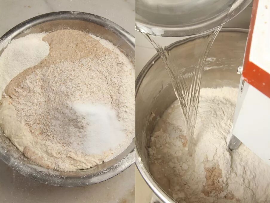 1. 將干性材料和全麥天然酵母稱好備用, 將干性材料倒入攪拌機(jī)中,加入水一起攪拌。