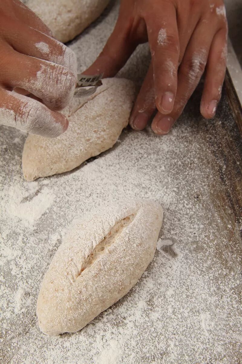 3. 將面團(tuán)排氣,卷成橄欖形。