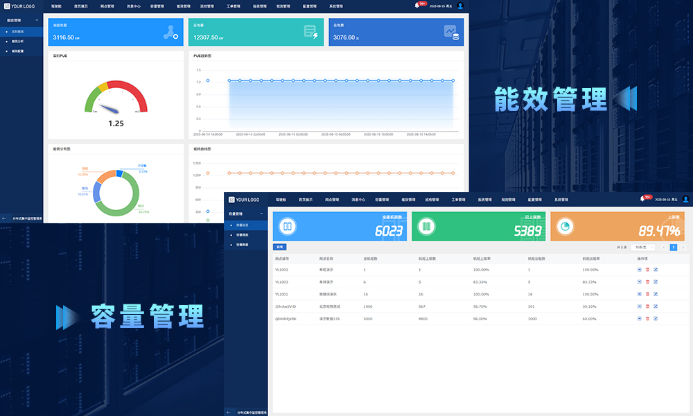 系統(tǒng)實(shí)時(shí)展示PUE、總能耗及各項(xiàng)能耗數(shù)據(jù),支持多維度能耗統(tǒng)計(jì),以優(yōu)化能源配置;容量管理方面則采用可視化方式呈現(xiàn)容量信息,支持多維度圖形化呈現(xiàn),輔助管理人員合理規(guī)劃資源分配